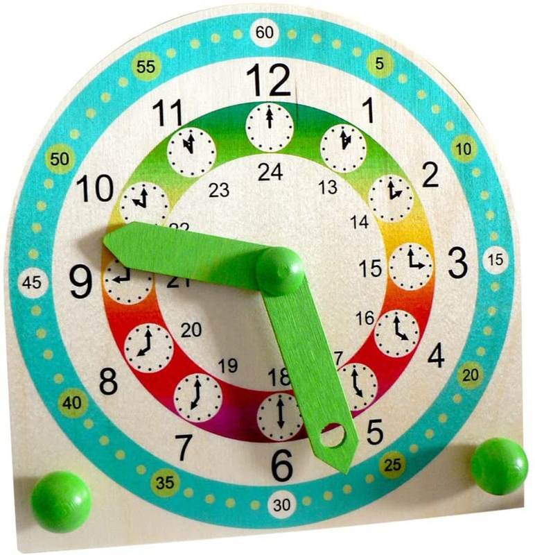 Fröhlich gestaltete Stand-Lernuhr aus dem Erzgebirge - ideal zur Entwicklungsförderung Ihres Kindes Mit dieser farbenfrohen Kinderlernuhr aus Holz, lernt Ihr Kind spielend leicht die Uhrzeit zu lesen ? ablesbar sind die Minutenziffern und 24-Stunden-Ziffern mit farbig lackiertem Ziffernblatt, bestehend aus zwei Ringen geeignet für Kinder ab 3 Jahren Maße: 18 x 18 x 2 cm Unser Tipp : Schenken Sie mit diesem hochwertigen Spielzeug ein Original in bester Holz-Qualität. Für ein altersgerechtes Spielen mit umweltverträglichen Naturmaterialien. Lieferumfang: Kinderlernuhr aus heimischen Hölzern Sicherheitshinweis: Achtung! Nicht geeignet für Kinder unter 18 Monaten. Nur unter direkter Aufsicht von Erwachsenen verwenden. Hess ? bringt Kinderaugen zum Strahlen