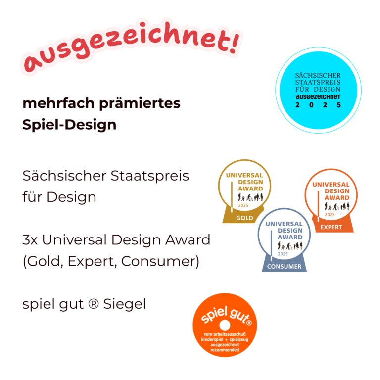Herausgekommen ist dieses geniale und gleichzeitig nachhaltig hergestellte Memoryspiel, das Barrieren abbaut und so gut ist, dass es auf Anhieb mehrere Preise gewonnen hat, (2025 mit dem Sächsischen Staatspreis für Design sowie dem Spiel Gut Siegel und gleich dreimal mit dem universal Design Award ausgezeichnet) und sogar für die Betreuung von Demenzpatienten geeignet ist.